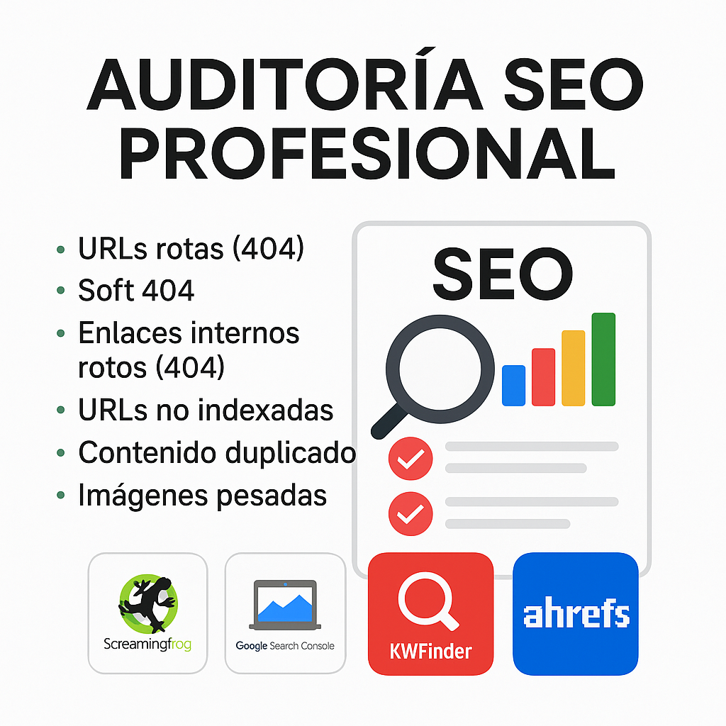 | Screaming Frog | Para rastrear el sitio web como lo hace Google, identificar URLs rotas (404), redirecciones, problemas de indexación, imágenes pesadas y enlaces internos. |
